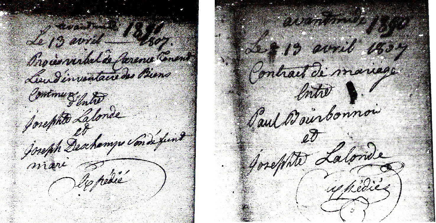 Here, the notary files for the inventory of Josephte Lalonde's deceased husband's estate -- the morning before the marriage contract on the same day April 13, 1807 -- between her and Paul Bourbonnais, while his son Claude was about 7 yrs old.