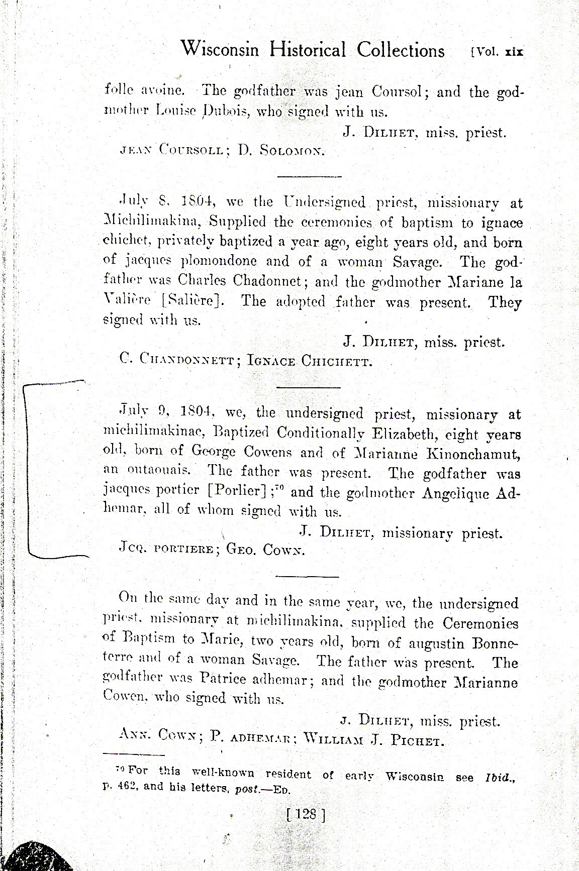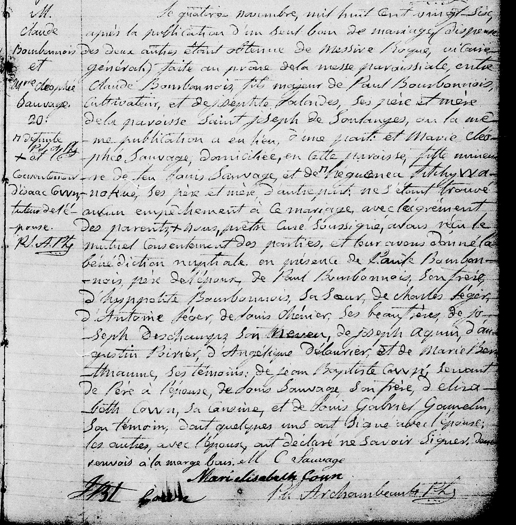 Marriage record for Claude Bourbonnais (born 1800) to Cleophee Sauvage in Vaudreuil QC -- both had Native mothers, and both of their fathers were fur traders together in Temiscaming QC.