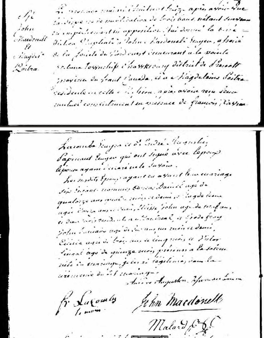 Marriage record for John Macdonell and Magdeleine Poitras -- notice it lists their children (and their ages) -- in Oka QC 1813