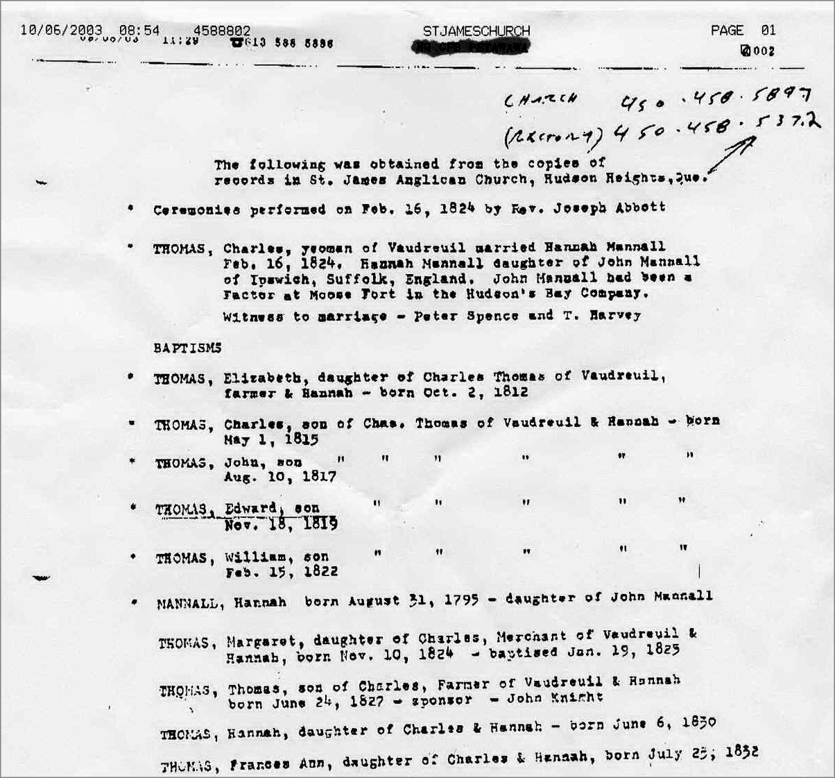 Records for the children of the fur trade Thomas family -- in Hudson QC -- St James Church - early 1800s