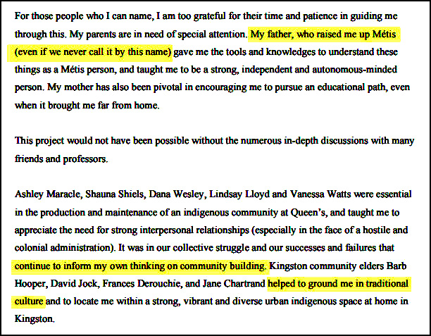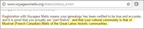where you will witness Adam Gaudry, University Professor, while listing which orgs in the east he feels do not have culture or communities -- He states -- "... the communities of the Voyageur Metis, another organization, state that getting a Metis status card means your genealogy has been verified to be true and accurate. It is proof that you actually are part Native." "(And part Native in this sense becomes Metis.)" -- his words, not ours. And here is the page section he took from our website, except he left out the end of the sentence --
