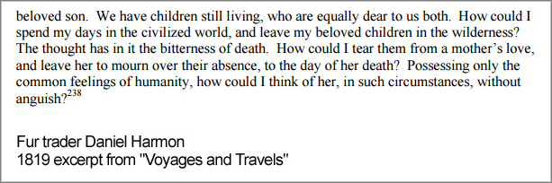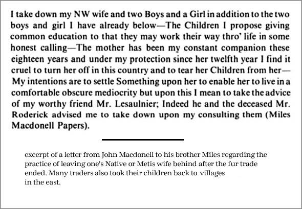 https://soundcloud.com/indigenousstudiesusask/native-studies-speakers-series-darryl-leroux-now-i-am-metis-how-white-people-become-indigenous We are not sure why Mr. Leroux has targeted 2 members of our community for his "presentation" but rather than study the sociological results of the hiding and oppression that occurred in Metis families and communities, this academic chose to discuss what he deems to be a cultural appropriation of sorts, and it appears he did this without presenting any evidence to prove his assertions. We find this shameful. We also find it shameful that he continues to point the finger on social media at persons in our community who have nothing to do with the information on our web pages and have not contributed to it whatsoever. These persons also have nothing to do with what Leroux claimed in his seminar to have written or believe about Metis families, communities, or identity. He also states in his presentation that there is no proof that children of the fur trade were taken back to Montreal yet we have proof from legal records that Metis children were brought back, which makes us wonder -- how many archival genealogical records and fur trade families has Mr. Leroux actually studied to come to this conclusion? You can find this proof by clicking here. And even if he had done this research, he doesn't seem to know that fur trade journals mention the practice of men not only leaving their Native wives behind in the west, but also taking their children from their mothers, leaving her to mourn them, as shown in these excerpts from fur trade journals --